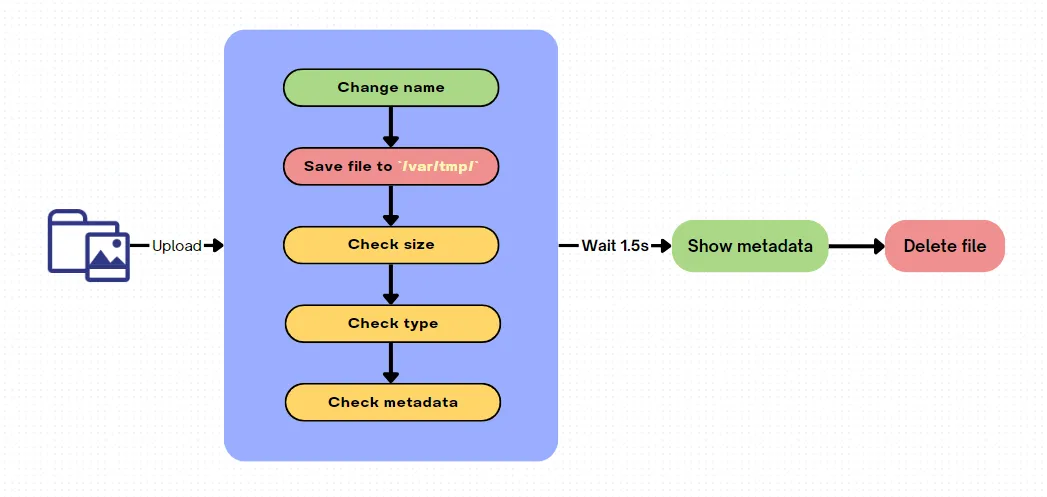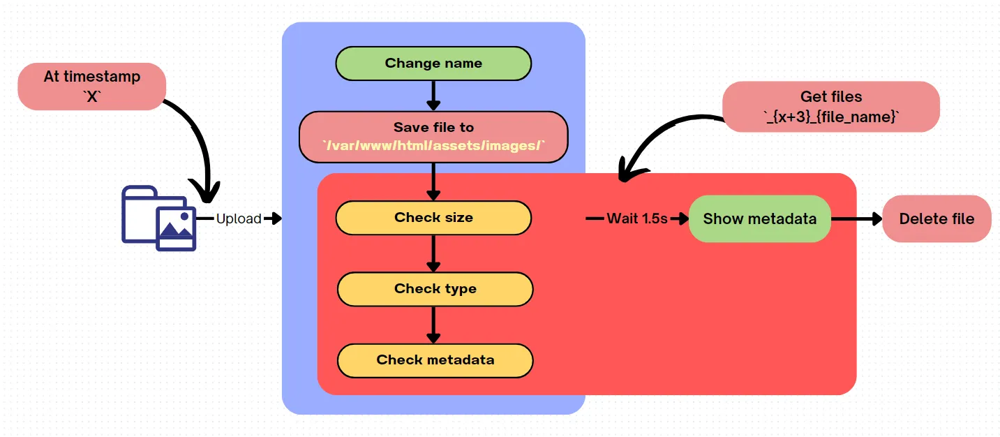 Có thể thấy lỗi logic cực kì nghiêm trọng ở đây, thay vì check trước rồi mới lưu thì lại lưu rồi check rồi mới xoá. Đã thế không xoá ngay lúc check định dạng file mà phải chờ 1.5s sau khi kiểm tra hết mọi thứ rồi mới check. Đây chính là thứ dẫn tới Race condition.
