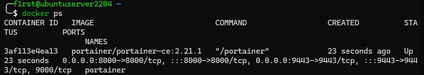 Chờ lệnh chạy xong, kiểm tra container bằng lệnh docker ps: