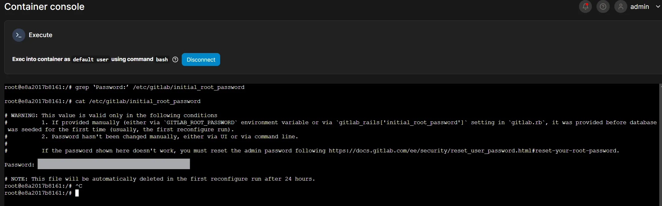 Mình sử dụng tính năng console của Portainer để tìm password cho root user