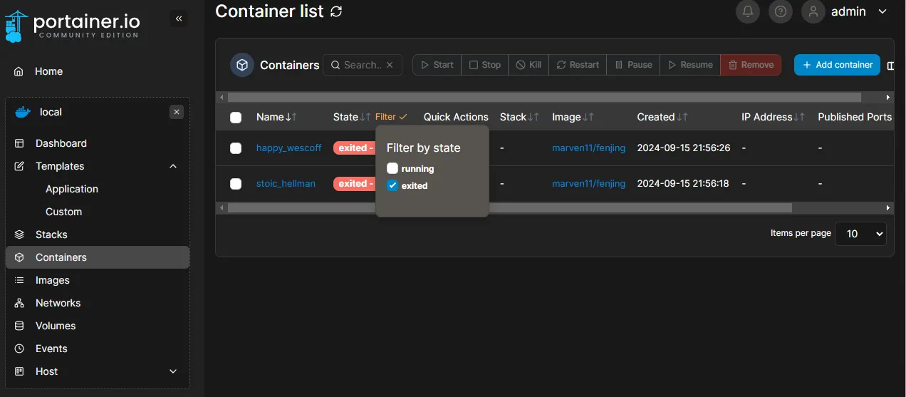 Ví dụ như ở đây mình có thể filter các container đang chạy, đã dừng, có thể xoá, thêm sửa rất dễ dàng từ giao diện.