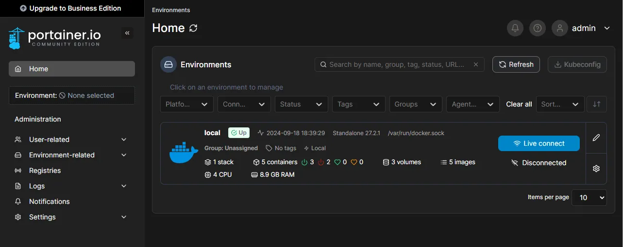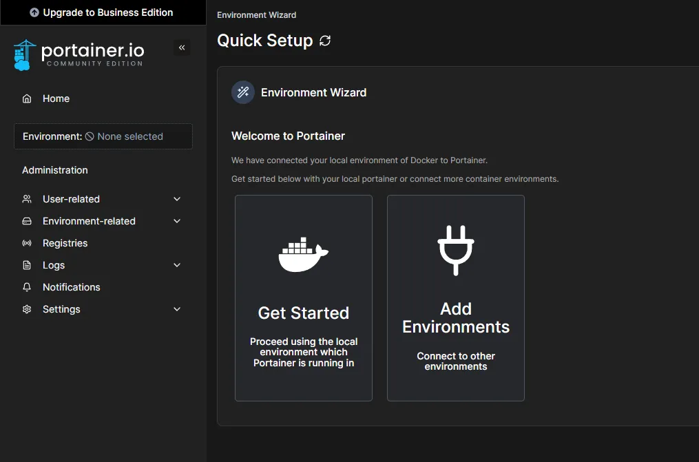 Như vậy là Portainer đã khơi chạy thành công và có thể truy cập từ trình duyệt qua địa chỉ https://[IP]:9443.