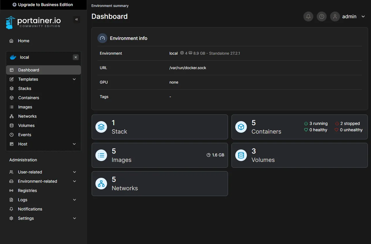 Có thể thấy Dashboard chứa nhiều thông tin chi tiết như số CPU, dung lượng RAM của host, số container, stack, volumes, images có trên host.