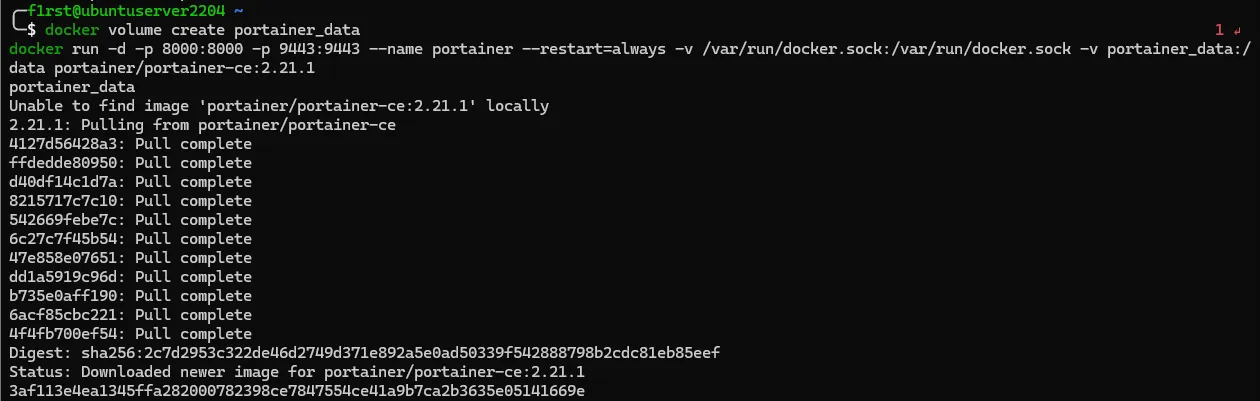 docker volume create portainer_datadocker run -d -p 8000:8000 -p 9443:9443 --name portainer --restart=always -v /var/run/docker.sock:/var/run/docker.sock -v portainer_data:/data portainer/portainer-ce:2.21.1