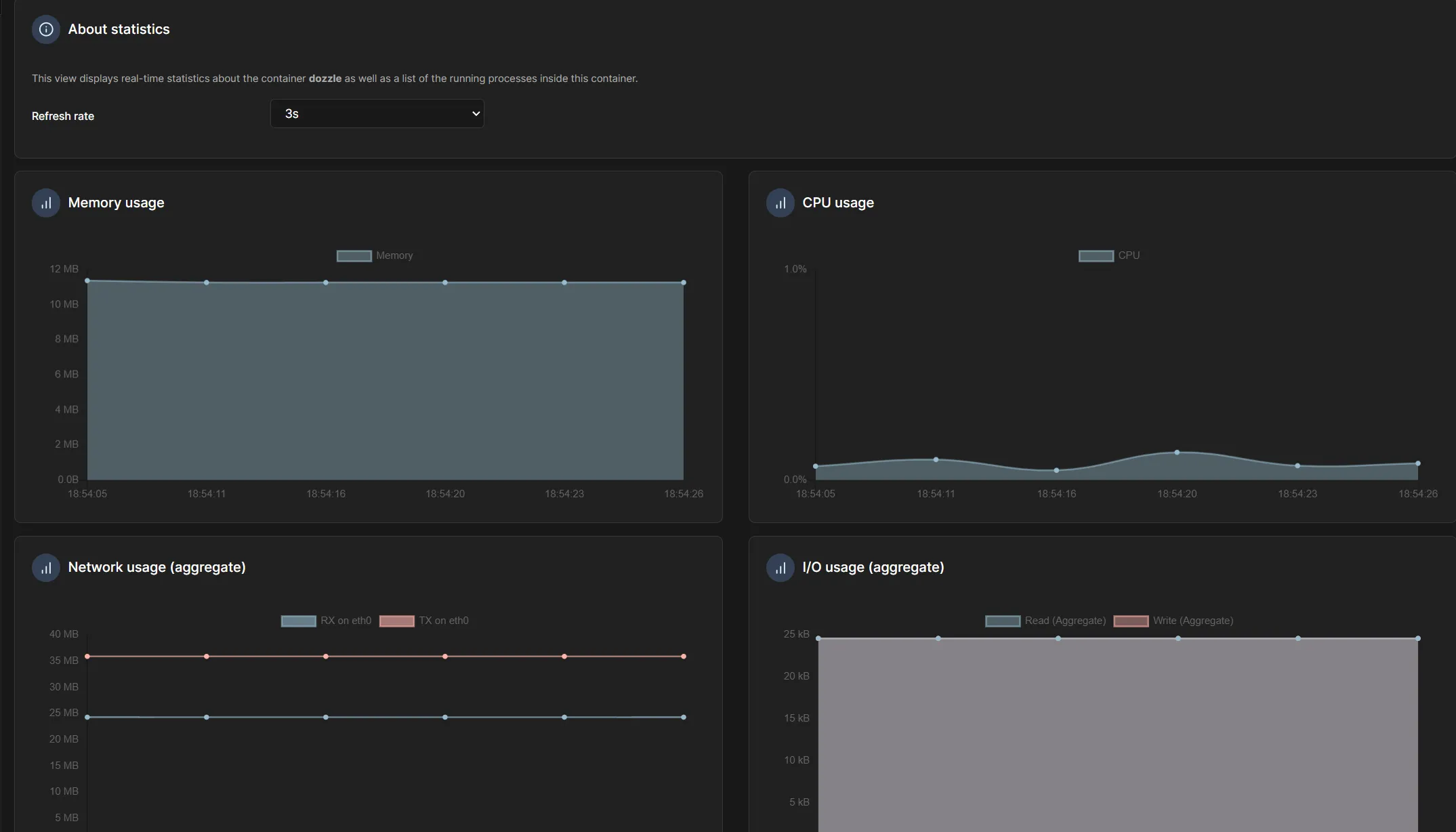 Chúng ta còn có thể xem được statistics của container như RAM sử dụng, CPU sử dụng và thậm chí có thể tuỳ chỉnh được refresh rate