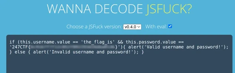 Các tool decode jsfuck này khá nhiều. Ở đây mình dùng tool này nhớ sửa version sang v0.4.0 nhé
