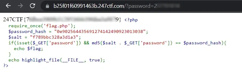 Lý do ở đây lại là chuỗi f789bbc328a3d1a3xxxxxxxx vì ở source code có md5($salt . $_GET['password']) == $password_hash) trong đó $salt . $_GET['password'] tương tự như salt + password trong python vậy, nó sẽ ghép 2 chuỗi này lại với nhau.